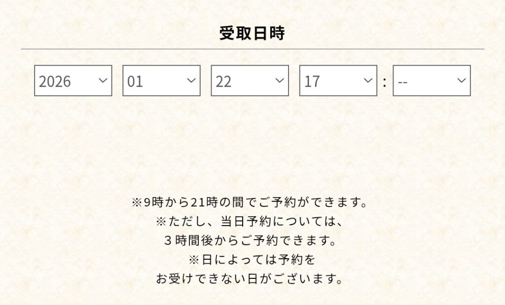 ネットでの当日予約は、受け取り時間が3時間後になりますので、注意してください。