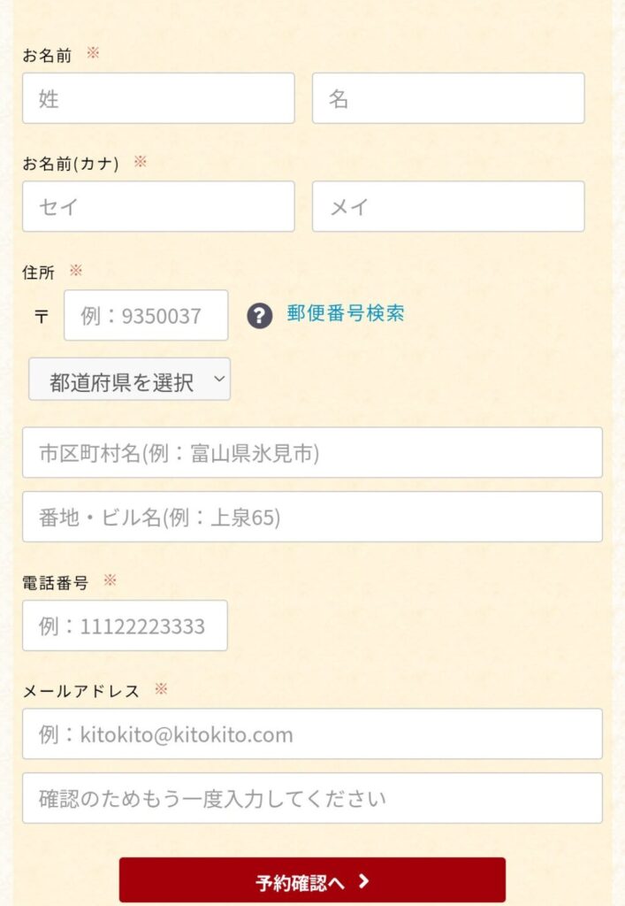 - 予約者のお名前や住所、電話番号を入力。「予約確認へ」ボタンをクリック
