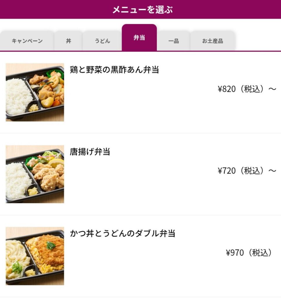 注文したいメニューを丼・弁当・麺類・一品・お土産品などから選んでいきます。