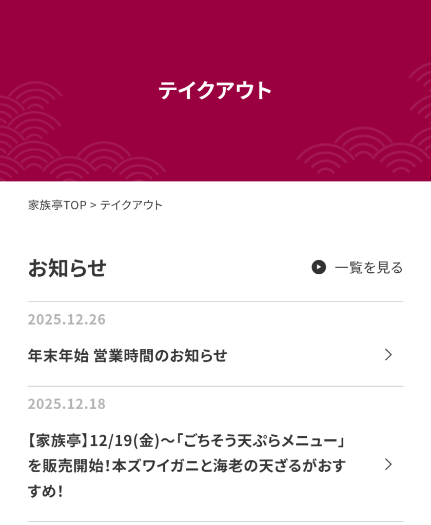 家族亭の公式サイトからテイクアウトを予約することができます。