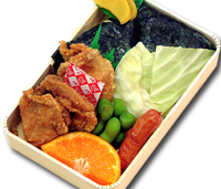 定番の若鶏むすび弁当には、唐揚げとむすびの他に、シャキシャキのキャベツ、枝豆、たくあんなどが添えられています。