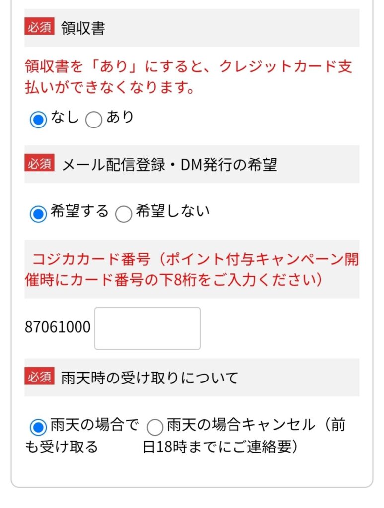 領収書の有無、メール登録希望しないかする、雨天時の受け取りについて選んでください。