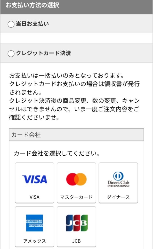 当日店舗でお支払いをするかクレジットカードで事前決済するか選んでください。