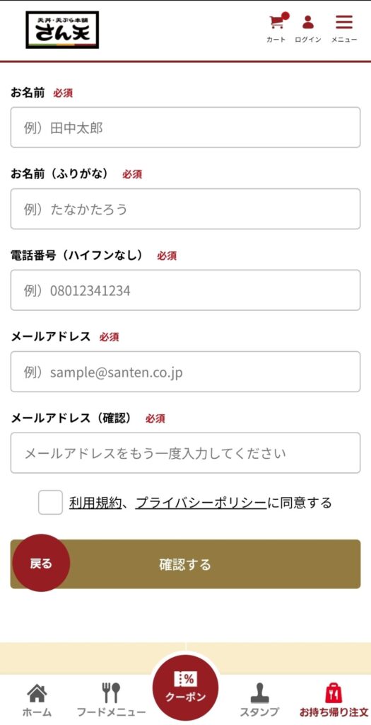 ゲスト注文の際は、名前・電話番号・メールアドレスを書いていきます。