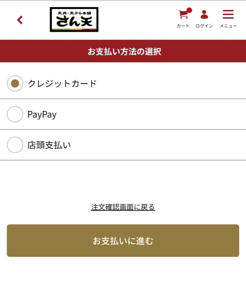 さん天のテイクアウトでは、オンライン注文時の事前決済と店頭での支払いが選択でき、それぞれ利用可能な決済方法が異なります。