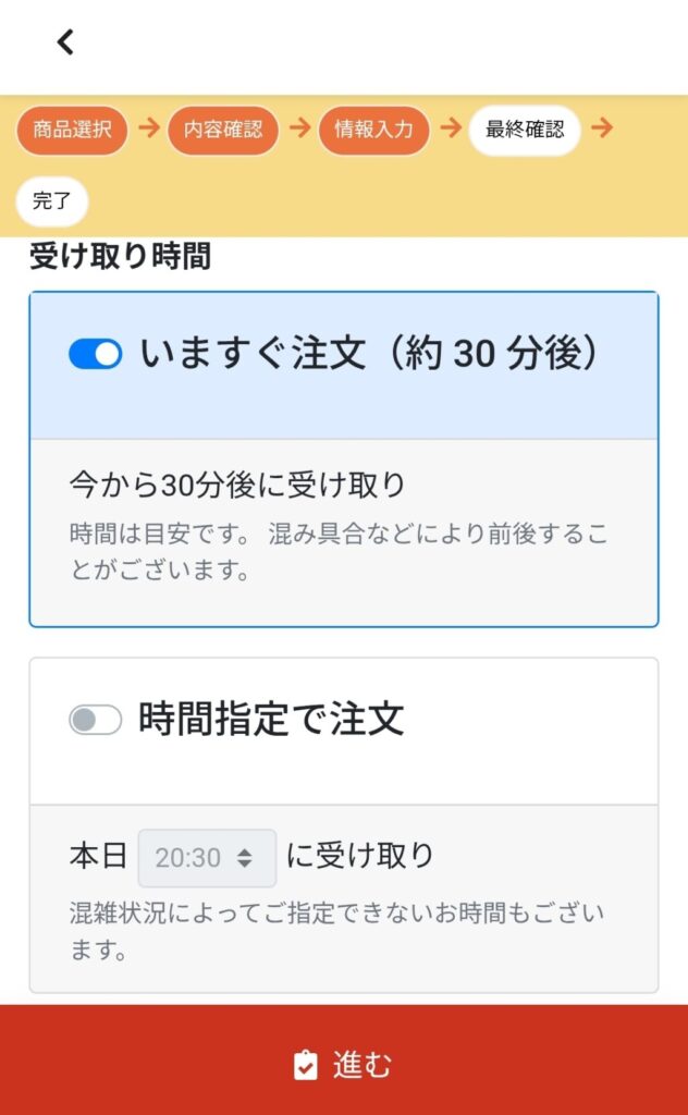 今すぐ注文されるか、時間指定で受け取るかどちらかを選択してください。