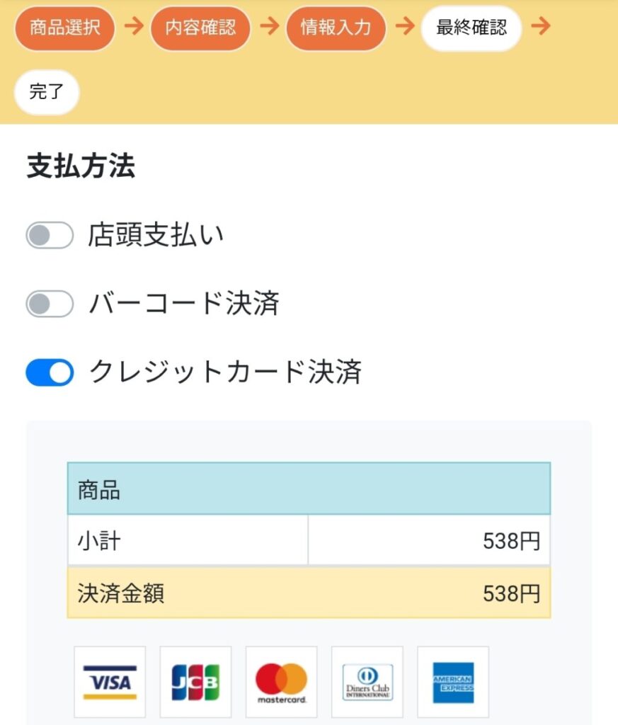 クレジットカード・現地決済・バーコード決済どれかを選んでください。
